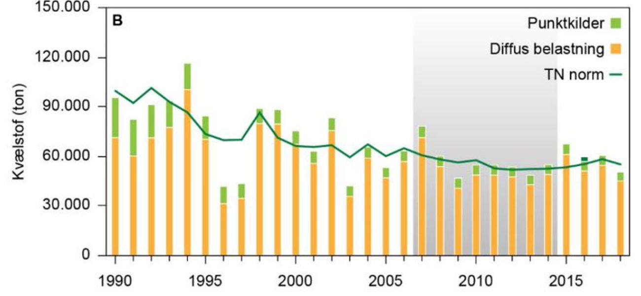 Figuren nedenfor viser med gult, hvordan udledningen af kvælstof har udviklet på landsplan sig fra 1990 til 2018. Den grønne del af hver søjle er udledning af kvælstof fra de såkaldte punktkilder, i denne sammenhæng især renseanlæg. Den gule del af søjlen er udledning fra såkaldte diffuse kilder, hvor hovedparten stammer fra landbrug.