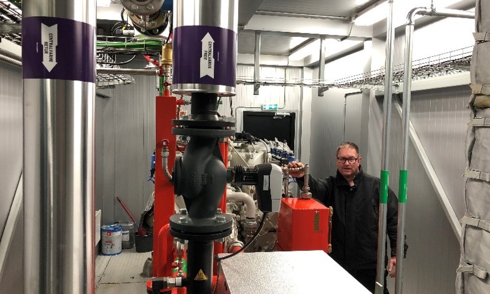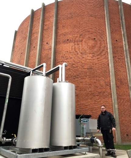 Brian Hansen Holm, som arbejder med drift, service og vedligehold i Vejle Spildevand ses her ved den nye gasmotor (tv.), som er forbundet til renseanlæggets rådnetank (th.). Slammet fra Vejlegensernes spildevand transporteres til rådnetanken, og ved forrådnelsen af slammet dannes der biogas, som ledes over i gasmotoren