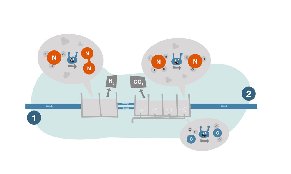 Da spildevandet fortsat indeholder store mængder organisk stof, kvælstof og fosfor, som forurener naturen, hvis det ikke fjernes, bliver spildevandet blandet med biologisk slam. Herefter starter en proces, hvor milliarder af mikroorganismer arbejder sammen for nedbryder det organiske stof og omdanne det til gasarter som kuldioxid og frit kvælstof. I én milliliter biologisk slam er der cirka lige så mange mikroorganismer (5x109), som der er mennesker på jorden (8x109).