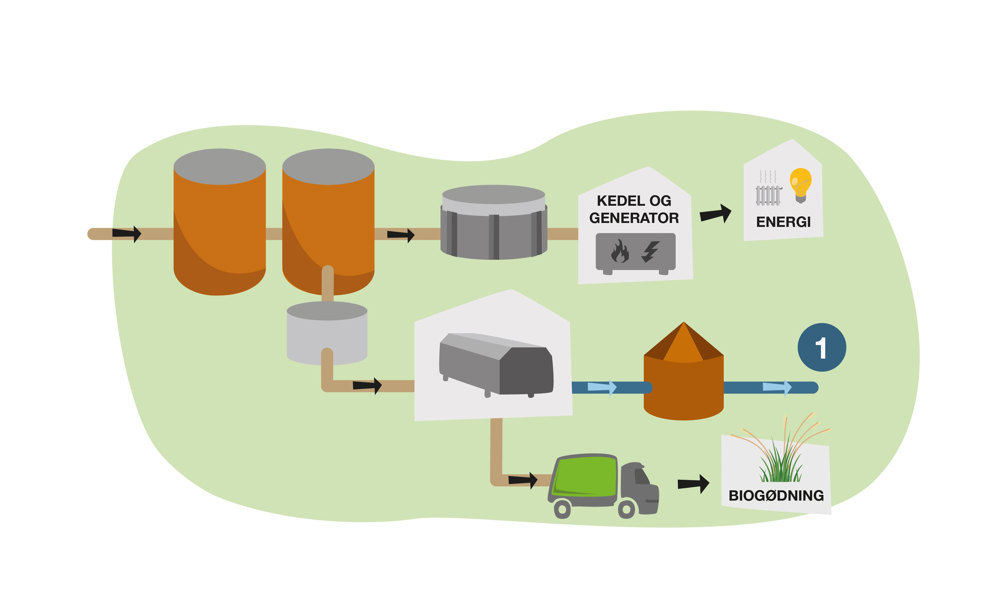Overskuddet af det biologiske slam bliver ført til rådnetanke. Under udrådningen dannes bl.a. metangas, som vi udnytter på en af vores to gasmotorer til at producere strøm. Resten af slammet bliver kørt på landbrugsjord som biogødning.