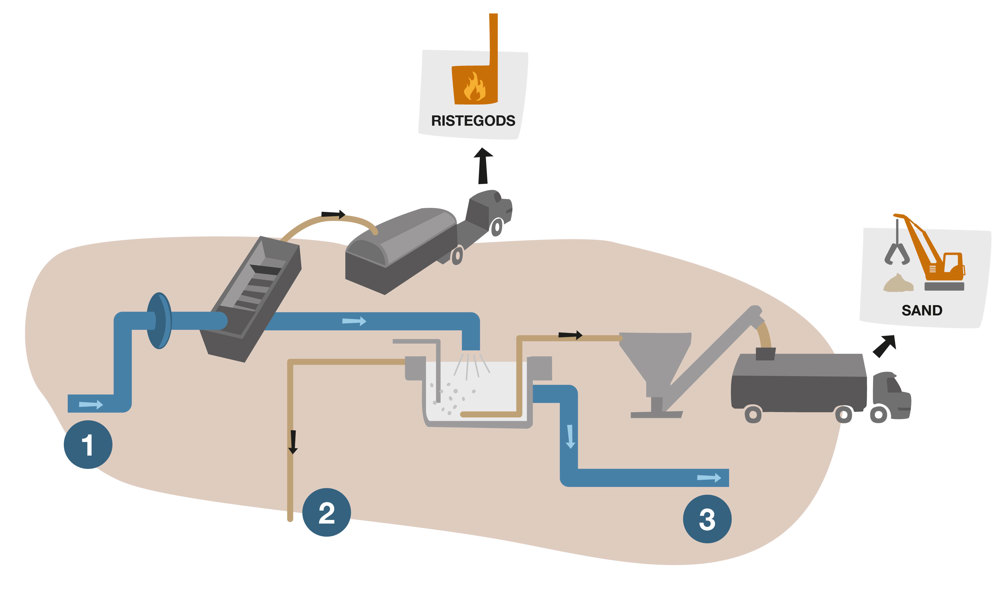 Når spildevandet ankommer til renseanlægget, bliver spildevandet ledt gennem riste, der fjerner sten, papir mv. Herefter bliver det ledt videre gennem et beluftet sandfang, hvor sand og grus bundfælder sig og kan fjernes. Fedt og olie vil samle sig i overfladen, så det kan skrabes af. Det er vigtigt at fjerne både fedt og sand, da det ellers vil kunne ophobe sig andre steder i anlægget.
