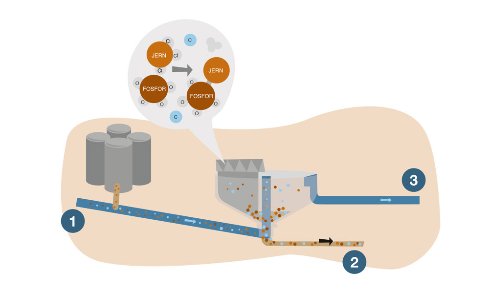 Når vandet forlader sand- og fedtfanget, tilsætter vi et jernsalt ved navn jernklorid, som går i forbindelse med vandets indhold af fosfor og organisk stof, og de partikler, der bliver dannet ved den kemiske forbindelse, bundfælder sig i anlæggets forklaringstanke. Vi pumper nu vandet videre til den biologiske rensning.