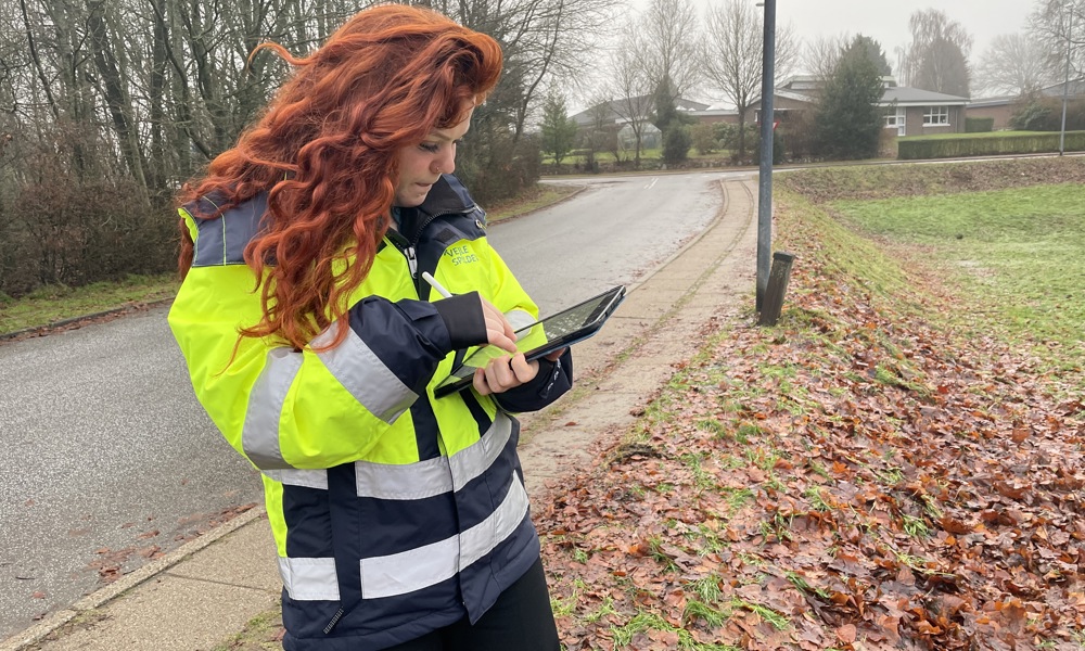 Kortet på iPad’en bliver gransket nøje, mens Stinne Plesner Skårup kigger ud over et grønt område: