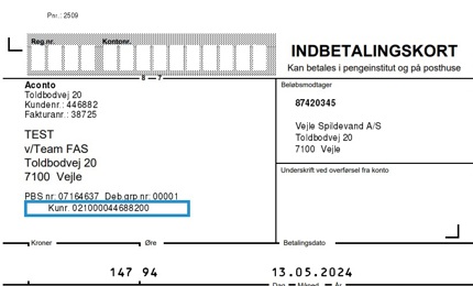 Når du tilmelder Betalingsservice, skal du bruge det 15-cifrede Kunr., der står nederst på indbetalingsskortet.