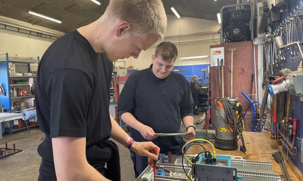 Kristian Korsgaard (bagerst) er Vejle Spildevands første automatikteknikerelev og er snart udlært. Han er i gang med at lære den nye elev, Benjamin Nielsen, op.
