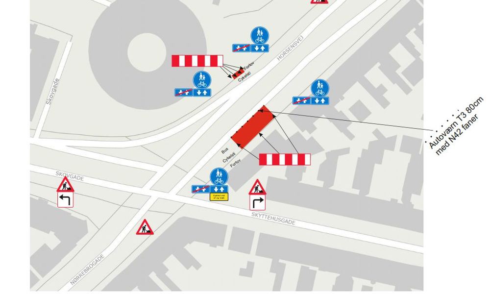 Cyklister og fodgængere kan også passere ved at følge skiltene.