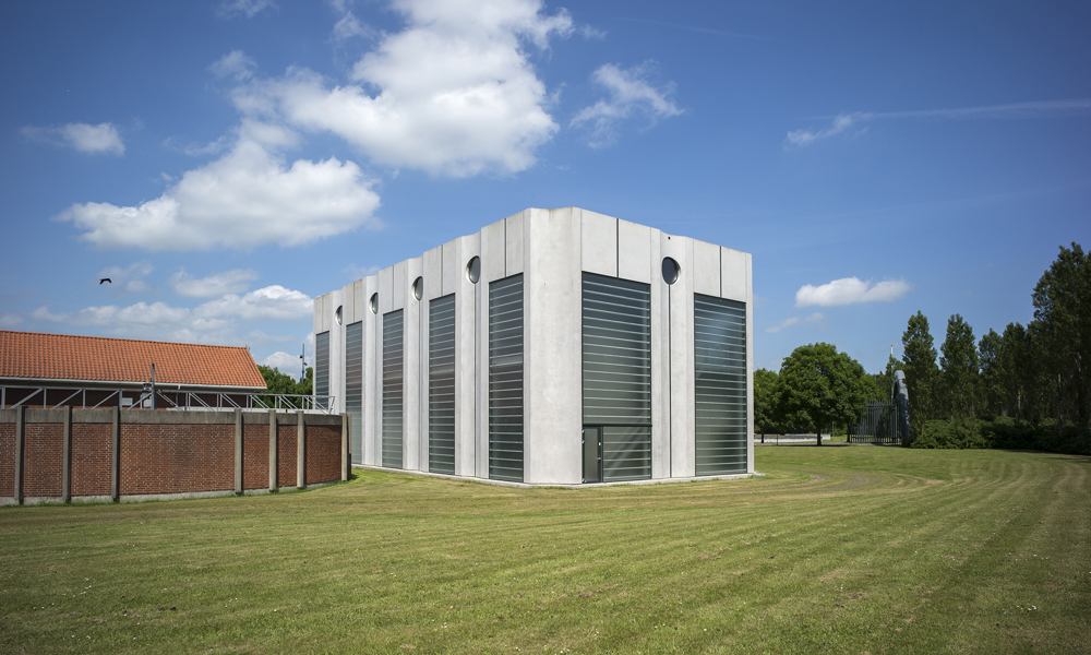 Slamhallen er tegnet af kunstneren Ingvar Cronhammar, der også står bag Vejle Spildevands indgangsport og skulpturen med poplerne ud til Toldbodvej. I sin introduktion fortalte direktøren, at slamhallen blev skabt i en god cocktail af cigaretter, rødvin, arkitektonisk snilde og nervøse ingeniørtrækninger – krydret med Ingvars krav om meget skarpe detaljeløsninger.