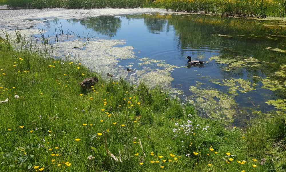 Et andepar med ællinger nyder et af vores vilde regnvandsbassiner