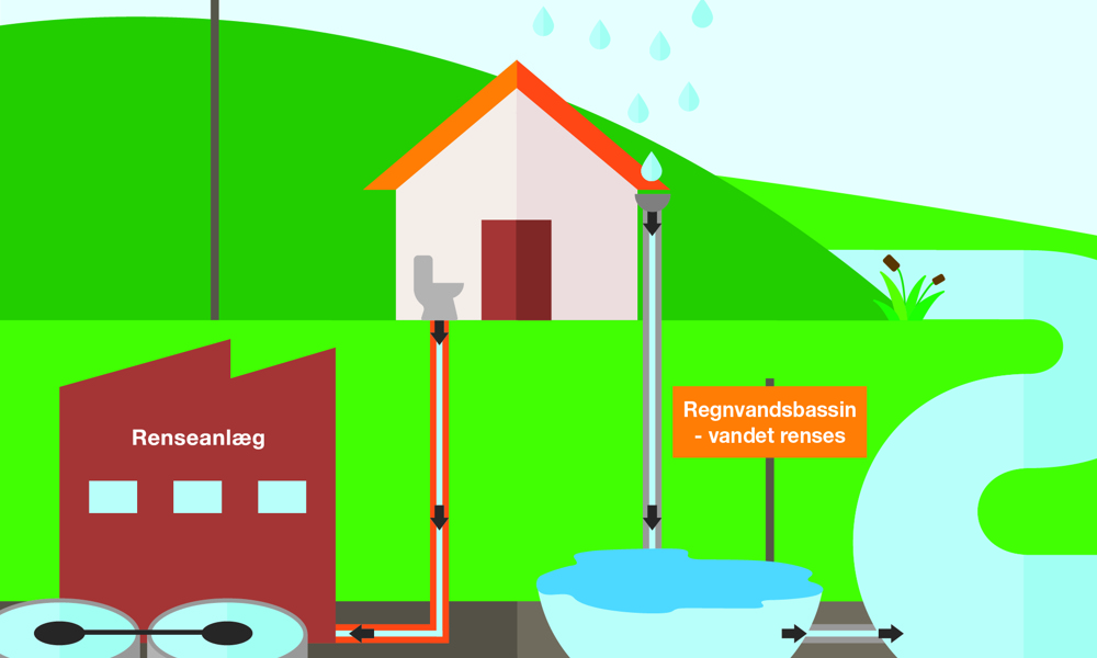 Vi moderniserer kloakkerne ved at lave en såkaldt separatkloakering. I dag løber spildevand og regnvand i ét rør, men når vi adskiller (separerer) rørene, så får vi spildevandet i ét rør og regnvandet i et andet rør.