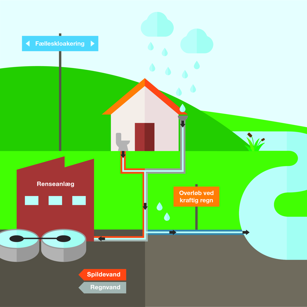 Fælleskloakering betyder, at regn- og spildevand løber i dette samme rør. Når det regner kraftigt, bliver kloaksystemet overbelastet, og der sker overløb.