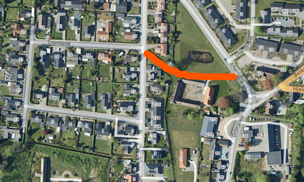 Ind- og udkørsel til Præstevænget/Trannisvej skal ske via grusvejen, der går mellem Præstevænget nr. 16 og 18 (forbi museet og videre til Aftensang)