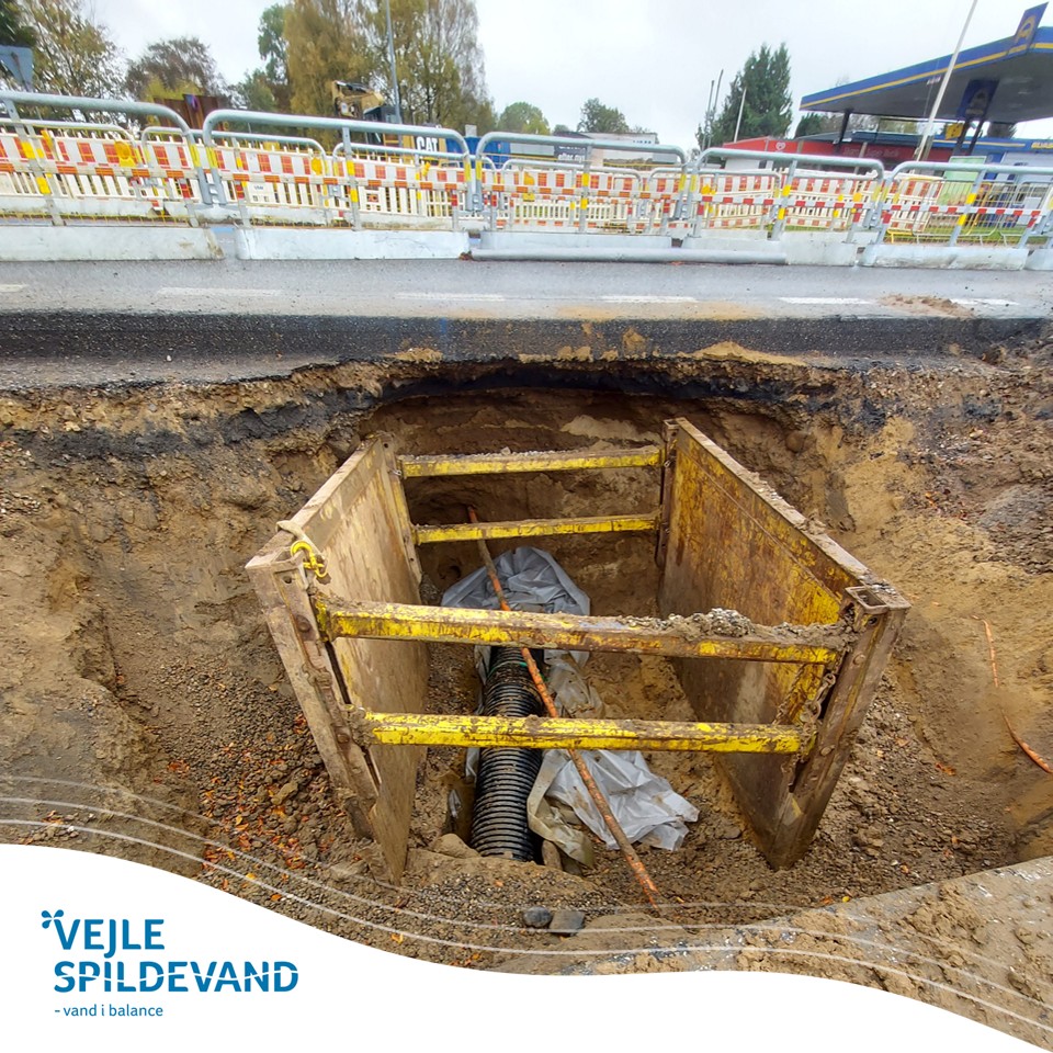 Vores borehoved og regnvandsledning har desværre sat sig fast lige midt under Fredericiavej – hvilket er lidt noget skidt.