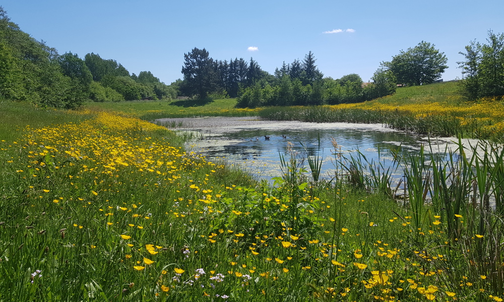 Regnvandet bliver ledt tilbage til naturen via et regnvandsbassin, som vi etablerer øst for byen. Det ligner en sø, men er et teknisk anlæg, hvor vandet kommer igennem en renseproces, inden vandet ledes ud i Vonge Bæk.